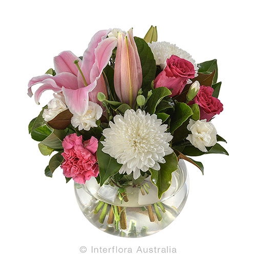 Say "Thank you" to a beautiful mum, stepmum, grandma, or aunt with our Anna arrangement. Featuring pink lilies and roses nestled amongst white chrysanthemums and carnations, this bouquet will delight the extraordinary women in your life. Styled with a modern glass fishbowl vase, these blooms will be admired by all.